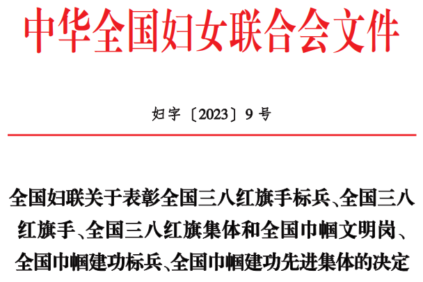 克日,中华天下妇女团结会印发《天下妇联关于表扬天下三八红旗头尖兵、天下三八红旗头、天下三八红旗整体和天下巾帼文明岗、天下巾帼立功尖兵、天下巾帼立功先进整体的决议》(妇字〔2023〕9号),3868la银河总站控股集团办公室行政部上榜,获评“天下巾帼文明岗”。