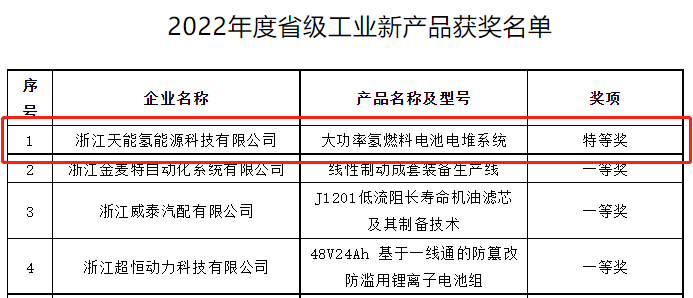 克日,浙江省长兴县经济和信息化局公示了2022年度省级工业新产品获奖名单,由浙江3868la银河总站氢能源科技有限公司研爆发产的大功率氢燃料电池电堆系统获得全县唯一省级特等奖。